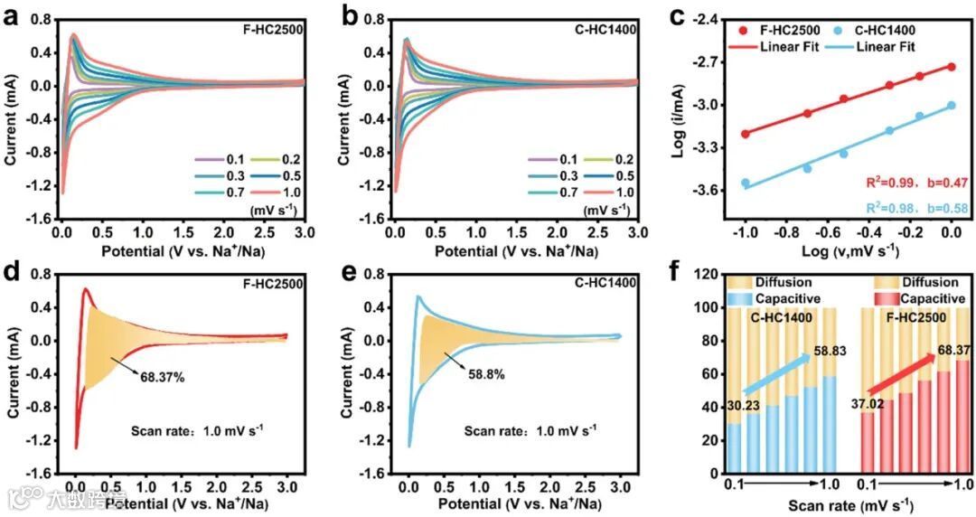 图4的动力学分析解释了为什么倍率好:b值计算(图4c)显示平台区以扩散控制为主,但电容贡献(图4d-f)快烧样在各扫速下都高——缺陷和孔多,表面电容行为强,离子跑得快。