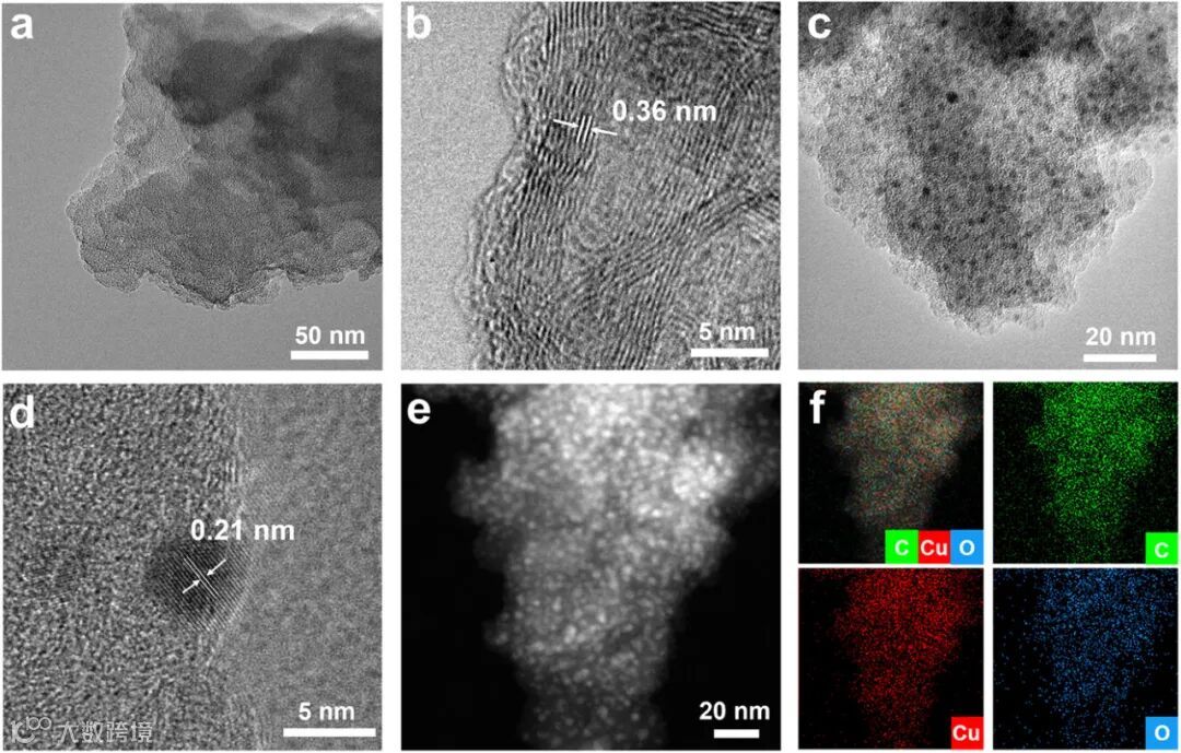 • HAADF-STEM 元素映射:C、O、Cu 均匀共域,无团聚。