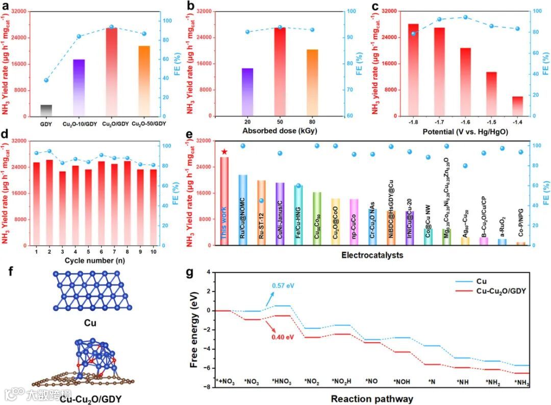 本工作首次将电子束辐照引入碳材料合成,突破了时间、气氛、单体稳定性三重瓶颈,为 GDY 从“克级”走向“公斤级”奠定了绿色高效新范式。同时,原位生成的 Cu₂O/GDY 异质结为硝酸盐废水资源化提供了高活性、高稳定原型催化剂。未来,电子束剂量-结构-性能数据库与卷对卷连续化工艺将成为研究重点。