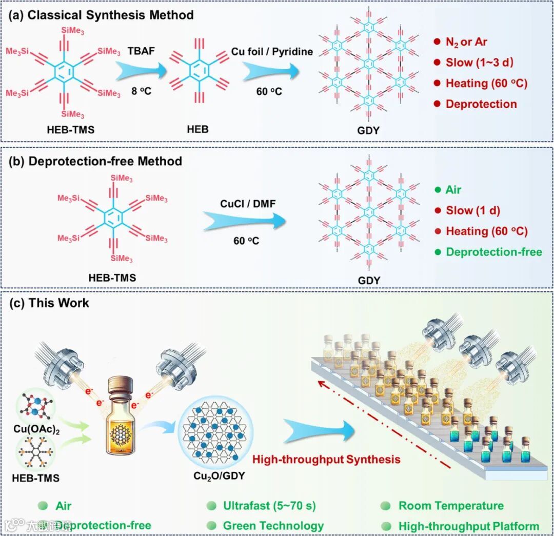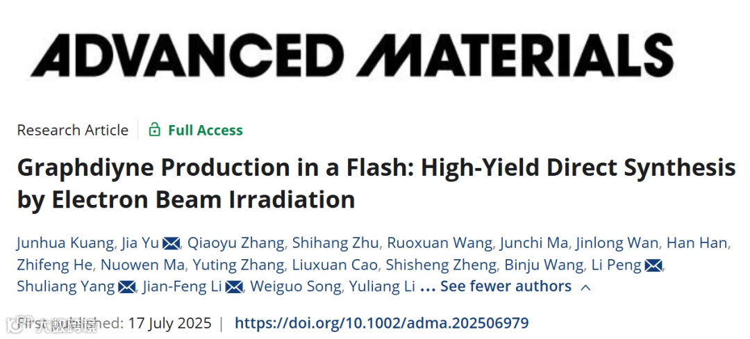 对科研人员而言,石墨炔(GDY)就像一张尚未完全展开的“碳元素画布”——sp 与 sp² 杂化赋予其可调控的带隙与极高载流子迁移率。然而,高活性单体、惰性气氛、数小时高温反应,一直把这张画布锁在实验室的通风橱里。7 月 17 日,厦门大学李剑锋团队在 Advanced Materials 发表最新成果,用一束高能电子束让稳定前体 HEB-TMS 在 70 秒内直接完成 GDY 构筑,产率逼近 100%,并同步获得 Cu₂O/GDY 异质结。中科精研为您拆解全文,并奉上可复现该“秒级合成”的实验级焦耳加热解决方案。