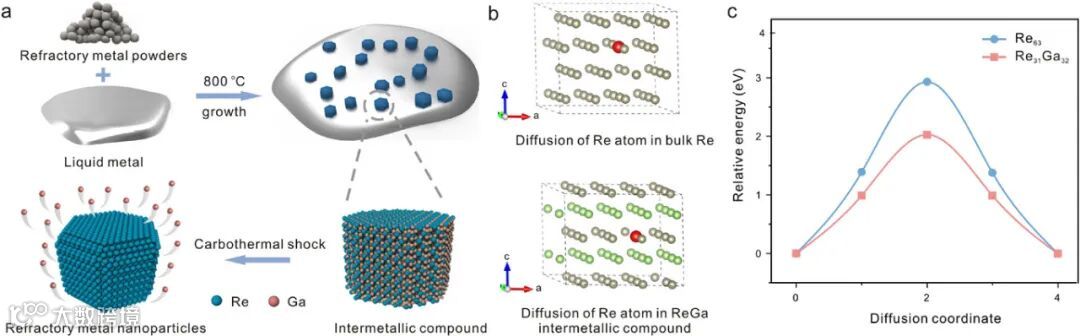 图1 合成机理:示意图清晰展示了在液态金属镓中,通过合金化形成ReGa₅中间相,再经去合金化促使铼原子重构,形成单晶纳米颗粒的完整过程。理论计算证实,该策略显著降低了铼原子的扩散能垒,为高质量单晶的形成提供了动力学基础。