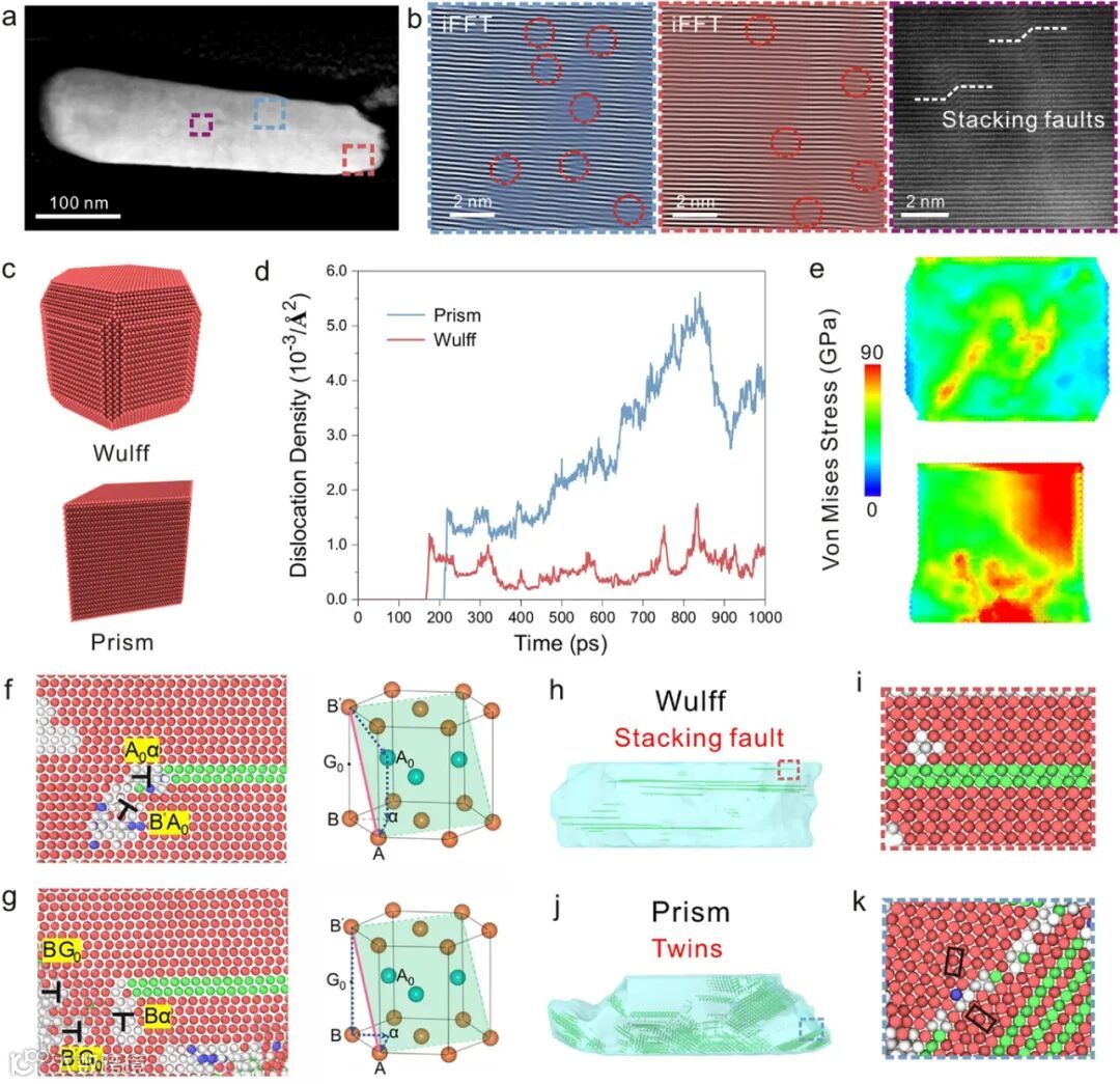 图4 变形机理:压缩50%后的STEM图像未见裂纹,iFFT分析观察到大量位错。分子动力学模拟对比发现,高度对称的Wulff结构能有效促进应力均匀分布,从而实现均匀塑性变形,而非对称结构则因应力集中导致早期失效。