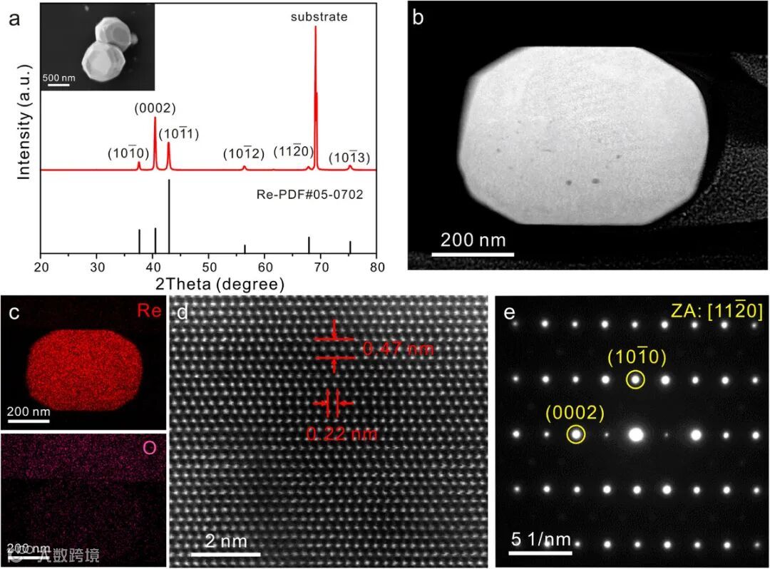 图2 结构表征:XRD与STEM结果证实,所得纳米颗粒为纯六方密堆结构单晶铼。高分辨HAADF-STEM图像展现了清晰的原子排列,SAED图谱显示明锐的衍射斑点,EDS面扫描则表明铼元素分布均匀且表面纯净无氧化。