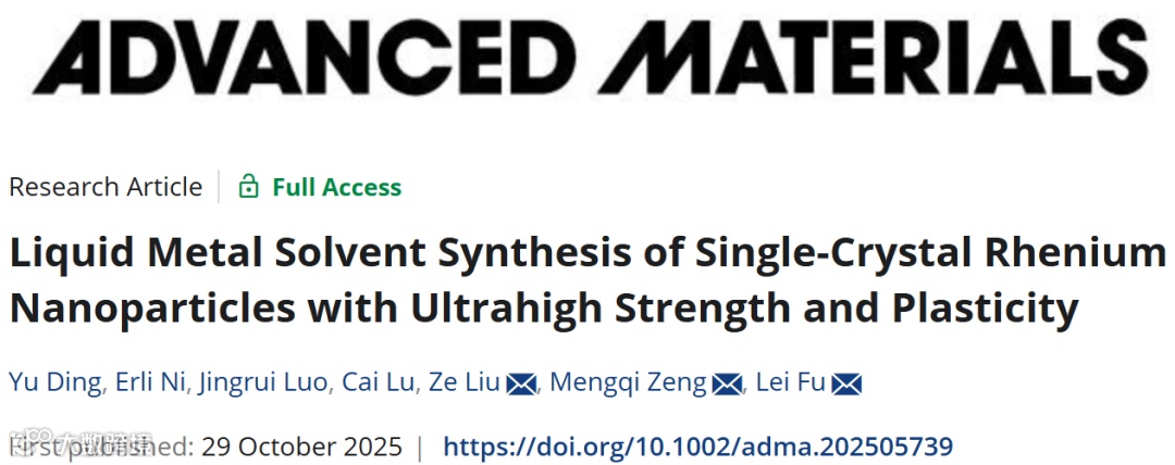 难熔金属纳米材料如何在保持超高强度的同时避免脆性断裂,是材料领域长期存在的难题。武汉大学付磊、曾梦琪、刘泽团队在材料学顶刊 《Advanced Materials》 上发表突破性研究成果。团队开发了一种液态金属溶剂合成策略,成功制备出完美单晶铼纳米颗粒,其压缩强度高达67.8 GPa,创下金属材料最高记录,并在80%的极大应变下仍不破裂,实现了强度与塑性的卓越结合。该工作为极端环境用高性能金属材料的制备提供了全新范式。
