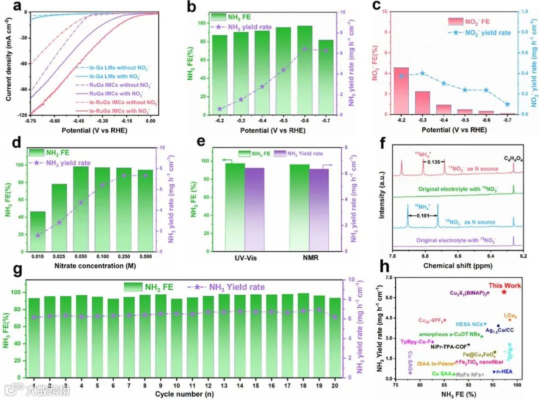 线性扫描伏安曲线显示,In-RuGa IMCs对硝酸盐还原反应具有极高的本征活性。在-0.6 V(相对于可逆氢电极)下,其氨法拉第效率高达97.3%,副产物亚硝酸盐的选择性始终低于5%。氨产率达到6.43 mg h⁻¹ cm⁻²的优异水平。催化剂在连续20次循环测试中性能保持稳定,展现了出色的耐久性。同位素标记实验最终确证生成的氨完全来源于硝酸盐的电催化还原。