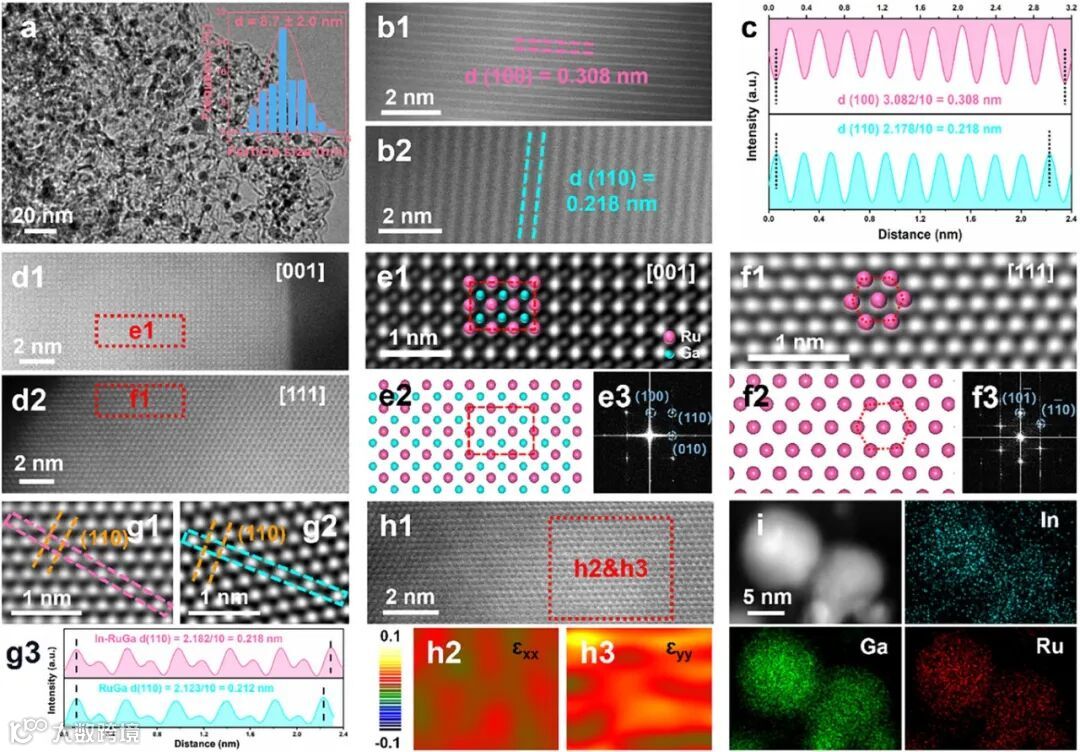 TEM和HRTEM图像证实,所合成的In-RuGa金属间化合物纳米颗粒尺寸均一(8.7 ± 2.0 nm),并在碳载体上均匀分散。高分辨图像显示清晰的晶格条纹(0.308 nm)。最具说服力的是像差校正HAADF-STEM图像,沿不同晶带轴直接揭示了Ru原子(亮)与Ga/In原子(暗)在晶格中的有序交替排列,完美符合体心立方结构模型。EDS元素面分布图进一步证明Ru、Ga、In三种元素在纳米颗粒内达到原子级均匀混合,无任何偏析。