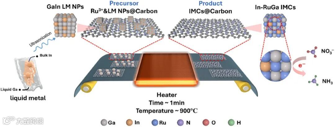 该图清晰展示了“一步快速合成”的核心策略:以高流动性液态Ga纳米颗粒为动态反应介质,与碳载体和钌前驱体均匀混合,经简单干燥后,通过焦耳加热装置进行约1分钟的快速热处理。液态Ga的关键作用在于其低粘度和高原子迁移率,极大地促进了Ru、Ga、In原子间的互扩散,从而在瞬间完成有序晶格的形成,从根本上避免了传统长时间退火导致的颗粒粗化和元素偏析。