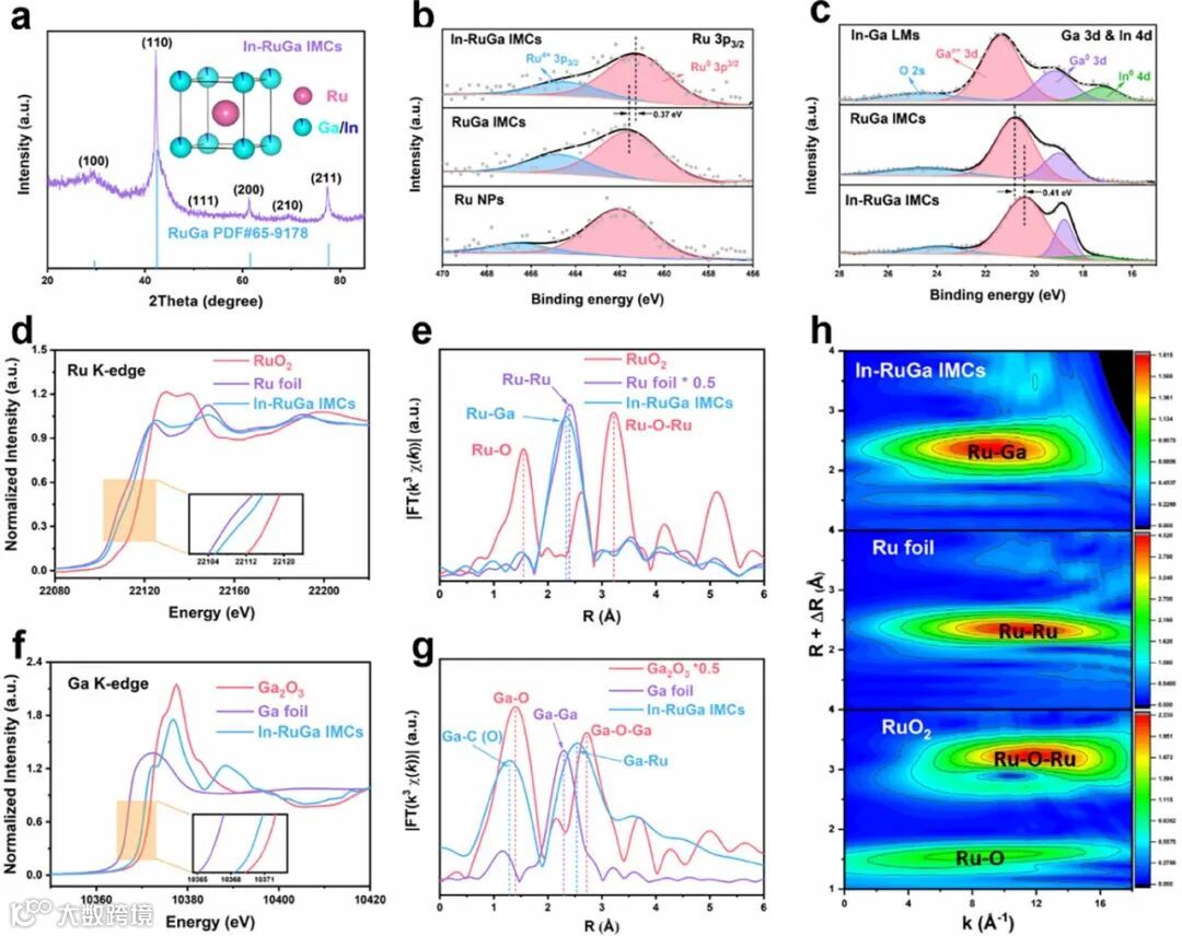 XRD谱图显示所有衍射峰均对应有序的bcc RuGa相,In掺杂引起峰位系统性偏移,表明晶格膨胀。XPS分析显示,与纯Ru相比,In-RuGa中Ru 3p结合能发生负向位移,证实电子从Ga和In向Ru转移,使Ru位点富电子化。EXAFS分析进一步确认了独特的Ru-Ga配位环境(配位数~8),与有序合金结构一致,这与金属Ru箔的配位结构截然不同。