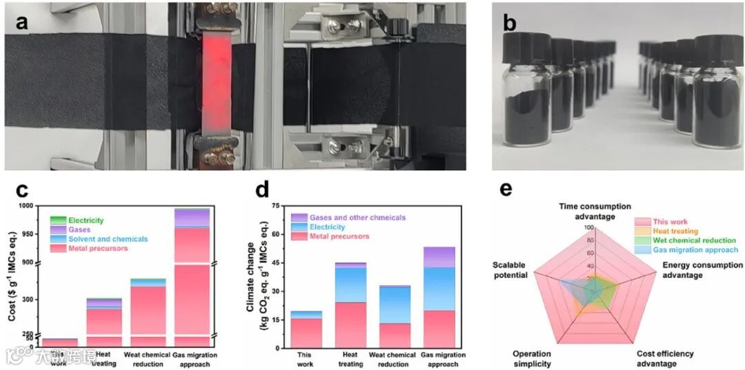 研究展示了基于卷对卷设备的规模化合成可行性。全面的技术经济与环境影响分析显示,该液态金属快速热扩散法在时间、能耗、成本、操作简易性及可扩展性五个维度全面优于传统合成方法。其每克催化剂生产成本低于50美元,温室气体排放当量仅为19.616 kg CO₂-eq,凸显了该方法在绿色制造和未来产业化方面的巨大潜力。