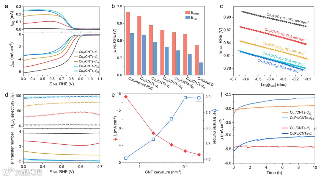 高曲率Cu₁/CNTs-d₁,H₂O₂产率低于3%,活性和动力学(图2c)直接对标商业Pt/C——这是能源转换的路。