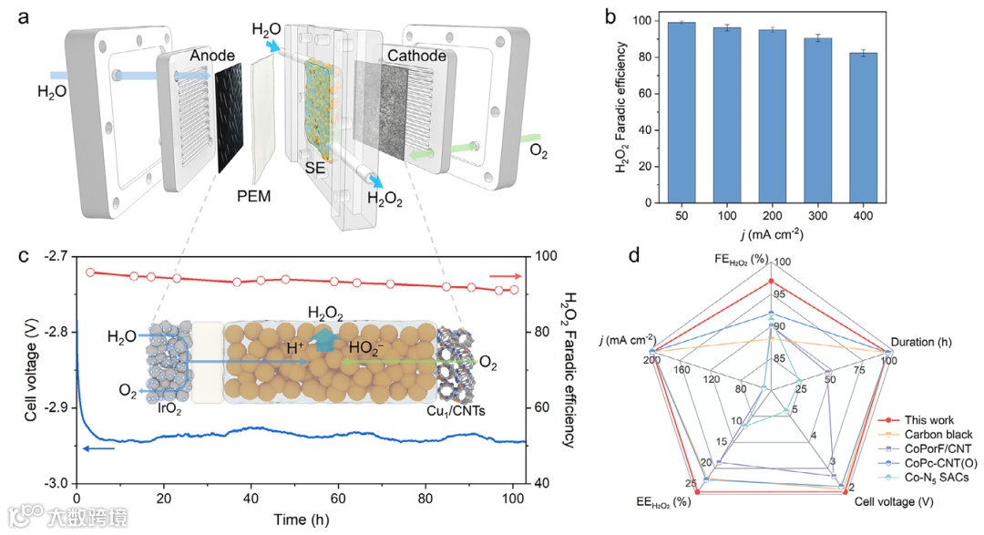 把最优2e⁻催化剂Cu₁/CNTs-d₂₀集成到固态电解质反应器里(图5a),200 mA/cm²工业级电流密度下,H₂O₂法拉第效率仍96.4%(图5b)。