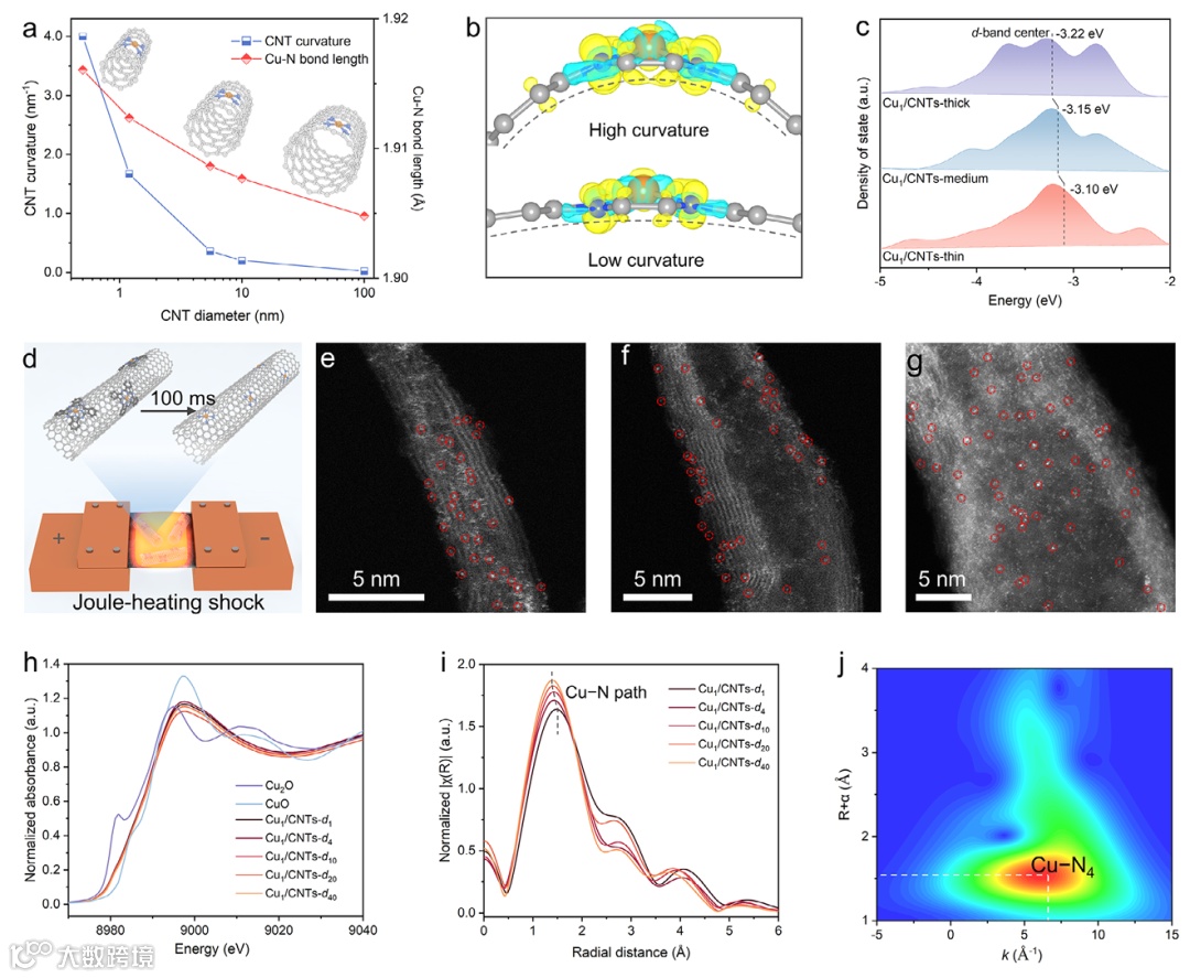 理论计算(图1b-c)先给个预测:高曲率CNT会把Cu-N键拉长,诱导电子从氮向铜转移,优化铜的电子结构。
