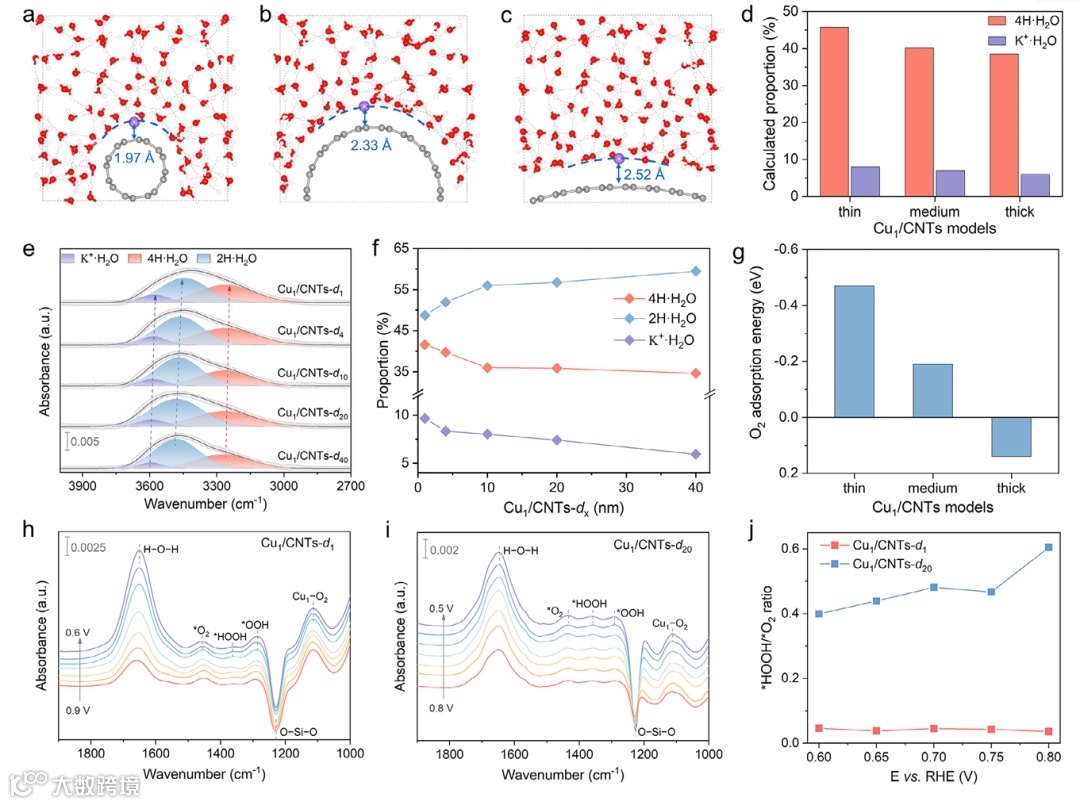 结合从头算分子动力学(AIMD)模拟和原位表面增强红外光谱(ATR-SEIRAS,图3e,f),发现:高曲率表面能富集K⁺离子,并诱导形成更有序的强氢键网络。