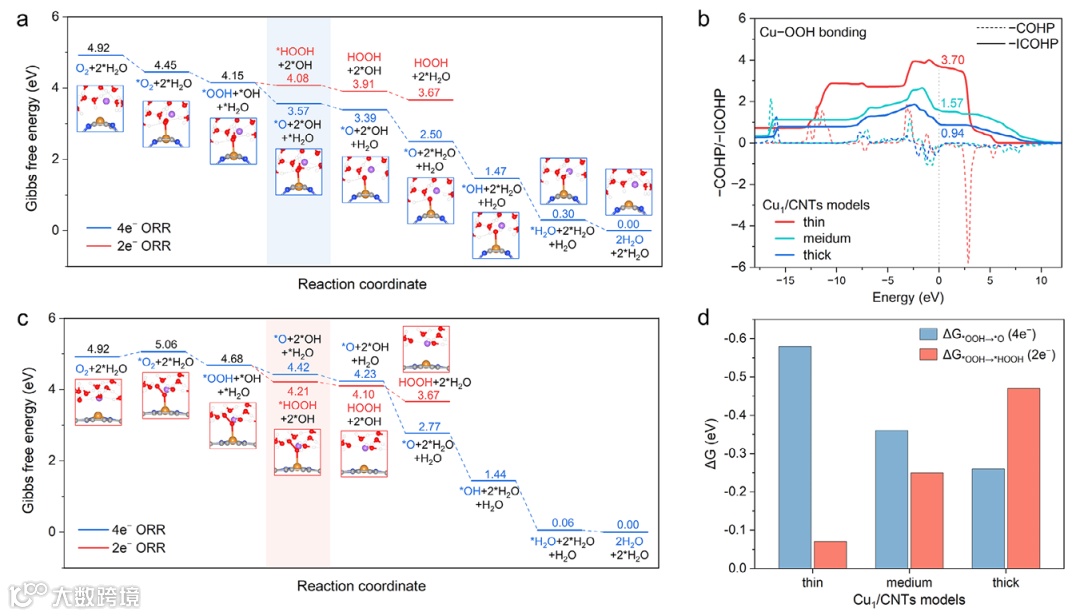 晶体轨道汉密尔顿布居(COHP,图4b)量化了Cu与*OOH的结合强度:高曲率下结合更强,O-O键更容易断,自然走4e⁻。