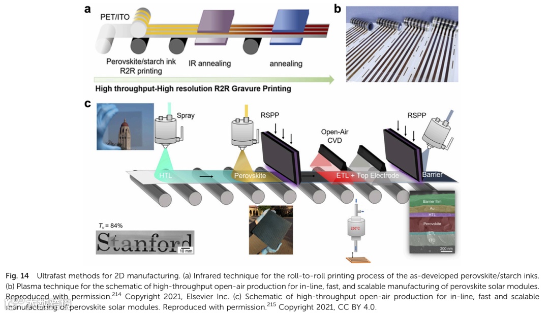 高吞吐量开放空气生产示意图 :图 14c 展示了高吞吐量开放空气环境下生产钙钛矿太阳能模块的示意图。
