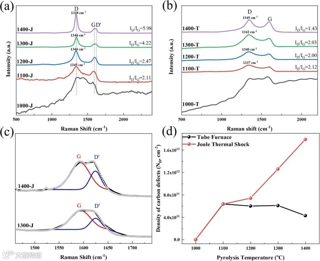 为什么超快加热反而能促进晶粒长大?图5的拉曼光谱提供了核心线索:焦耳热冲击样品的D峰与G峰强度比显著更高,表明其内部的自由碳具有更高度的无序结构和缺陷密度。