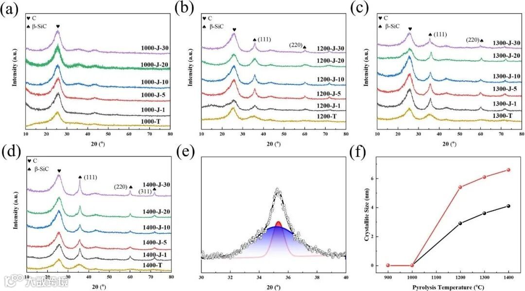 图3的XRD数据则带来了第一个关键发现:与传统管式炉样品相比,在相同温度下,焦耳热冲击样品的SiC衍射峰强度更高、峰宽更窄。通过谢乐公式计算,1400°C下焦耳热冲击样品的晶粒尺寸达到6.6 nm,而管式炉样品仅为4.1 nm。更有趣的是,对衍射峰进行精细拟合(图3e)发现,焦耳热冲击样品需要“双峰”才能完美拟合,这暗示了材料内部存在着尺寸差异显著的两类晶粒。