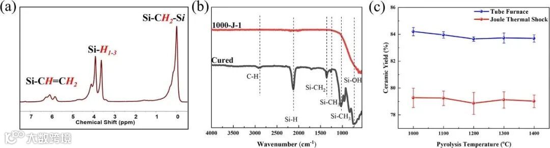 图2 通过核磁与红外光谱证实,经过焦耳热冲击后,前驱体的有机特征峰完全消失,转变为非晶SiC的宽吸收带,标志着聚合物到陶瓷的快速、完全转变。
