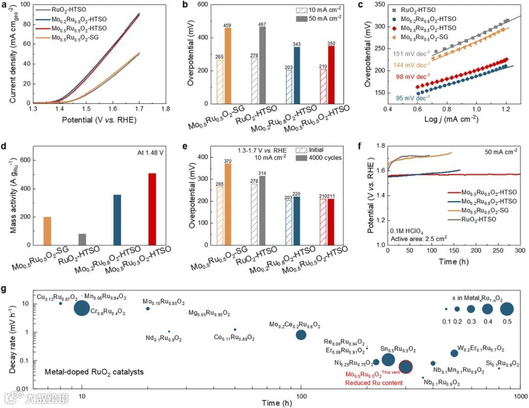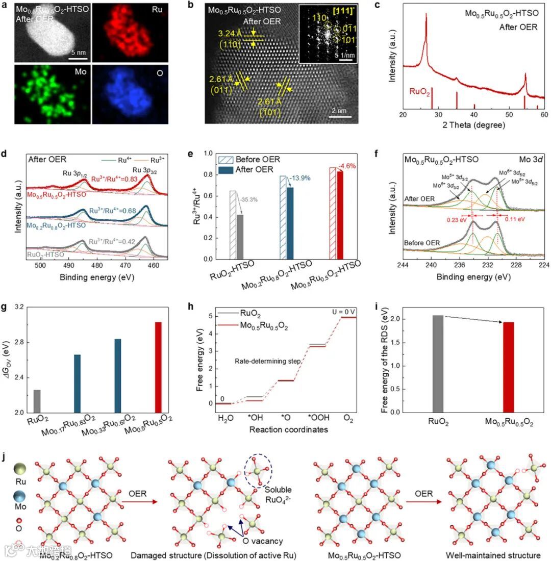 机制深度阐释:高价Mo掺杂如同“晶格支柱”,显著提升氧空位形成能,从根源抑制Ru溶解,破解“活性-稳定性”权衡魔咒。