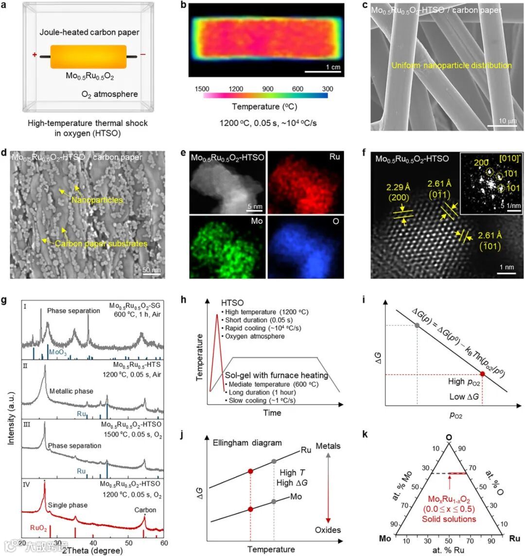 SEM/TEM及元素面扫证实所合成纳米颗粒(~10 nm)中Mo、Ru、O元素高度均匀分布。原子分辨HAADF-STEM与XRD共同确证材料具有与RuO₂一致的单一四方晶相。系统实验结合埃林汉姆图分析指出,富氧气氛、适宜高温与急速淬冷是成功合成单相固溶体的三大关键。