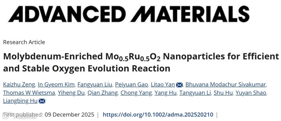 质子交换膜水电解制氢技术的“心脏”——酸性析氧催化剂,其活性与稳定性不可兼得的世纪难题迎来重大突破!耶鲁大学胡良兵教授团队在材料学顶刊《Advanced Materials》 上发表颠覆性研究成果。该团队开创 “氧气氛高温热冲击” 合成法,成功制备出高钼含量(50 at%)的单相Mo₀.₅Ru₀.₅O₂催化剂,在酸性环境中实现了210 mV的低过电位,并在50 mA cm⁻²高电流下稳定运行超过300小时,其稳定性远超纯RuO₂及所有已报道的掺杂催化剂,为低成本、长寿命绿氢生产提供了革命性材料解决方案。