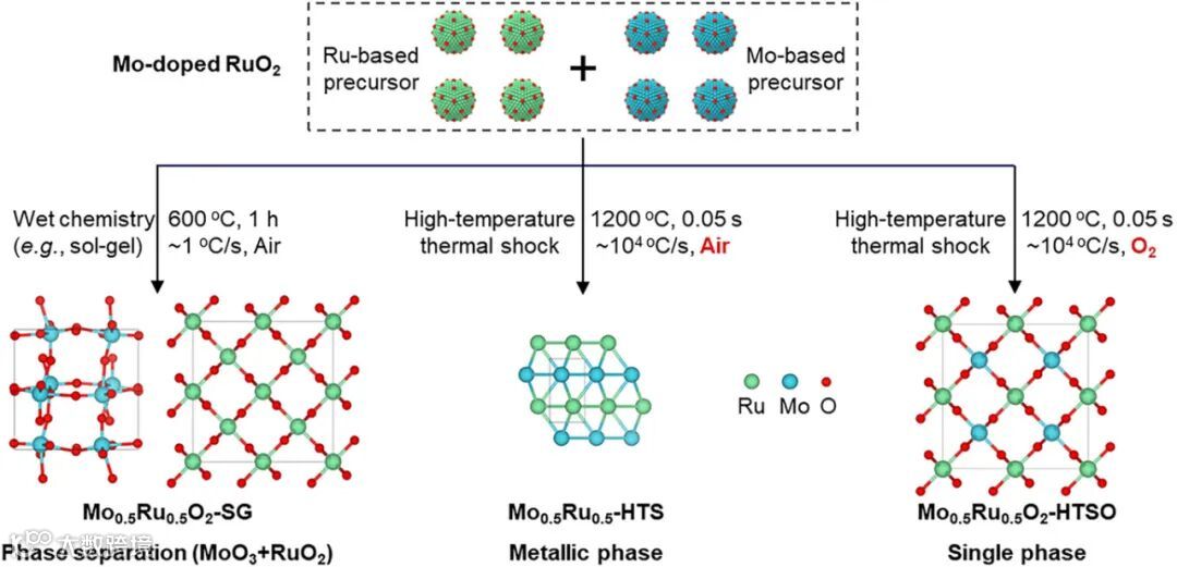 研究清晰对比了三种方法:传统溶胶-凝胶法因慢速升温冷却导致MoO₃与RuO₂相分离;空气热冲击法因缺氧生成金属相;唯有在富氧气氛下实施超高温瞬时加热与急速淬冷,才能将Mo、Ru原子“冻结”在单一四方相晶格中,获得高稳定性单相纳米颗粒。