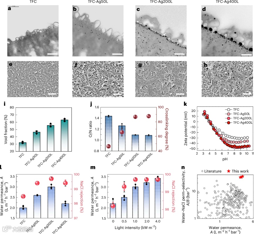 图1展示了等离子体纳米加热诱导界面聚合的创新制备过程。通过在界面聚合过程中引入银纳米颗粒,利用其局域光热效应调控反应动力学,形成高交联且具有纳米空隙的聚酰胺选择层,为性能突破奠定结构基础。