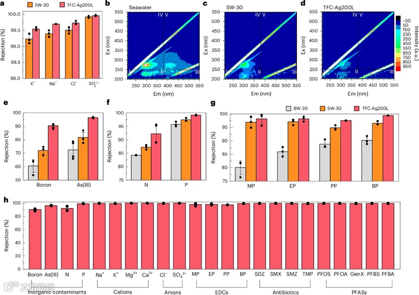 图4验证了膜的实际应用效果。在天然海水淡化中,产水盐度显著低于常规RO膜;同时对硼、砷(III)、内分泌干扰物和全氟化合物等难处理污染物均实现接近完全去除,显示出卓越的综合净化能力。