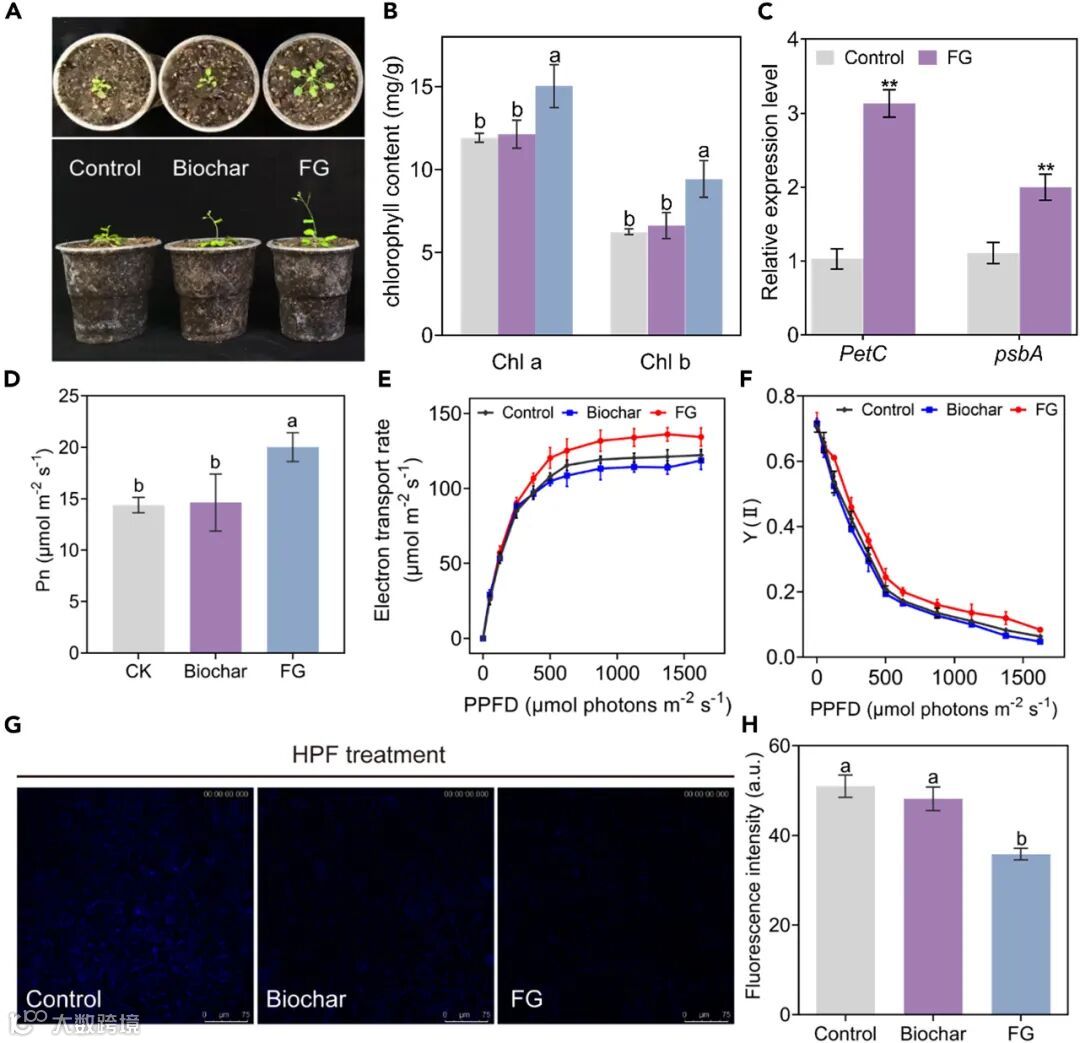 图3 深入揭示了FG促进光合作用的内在机制,处理组叶片叶绿素含量、净光合速率及光系统II电子传递速率均显著提升,羟基自由基水平明显降低。