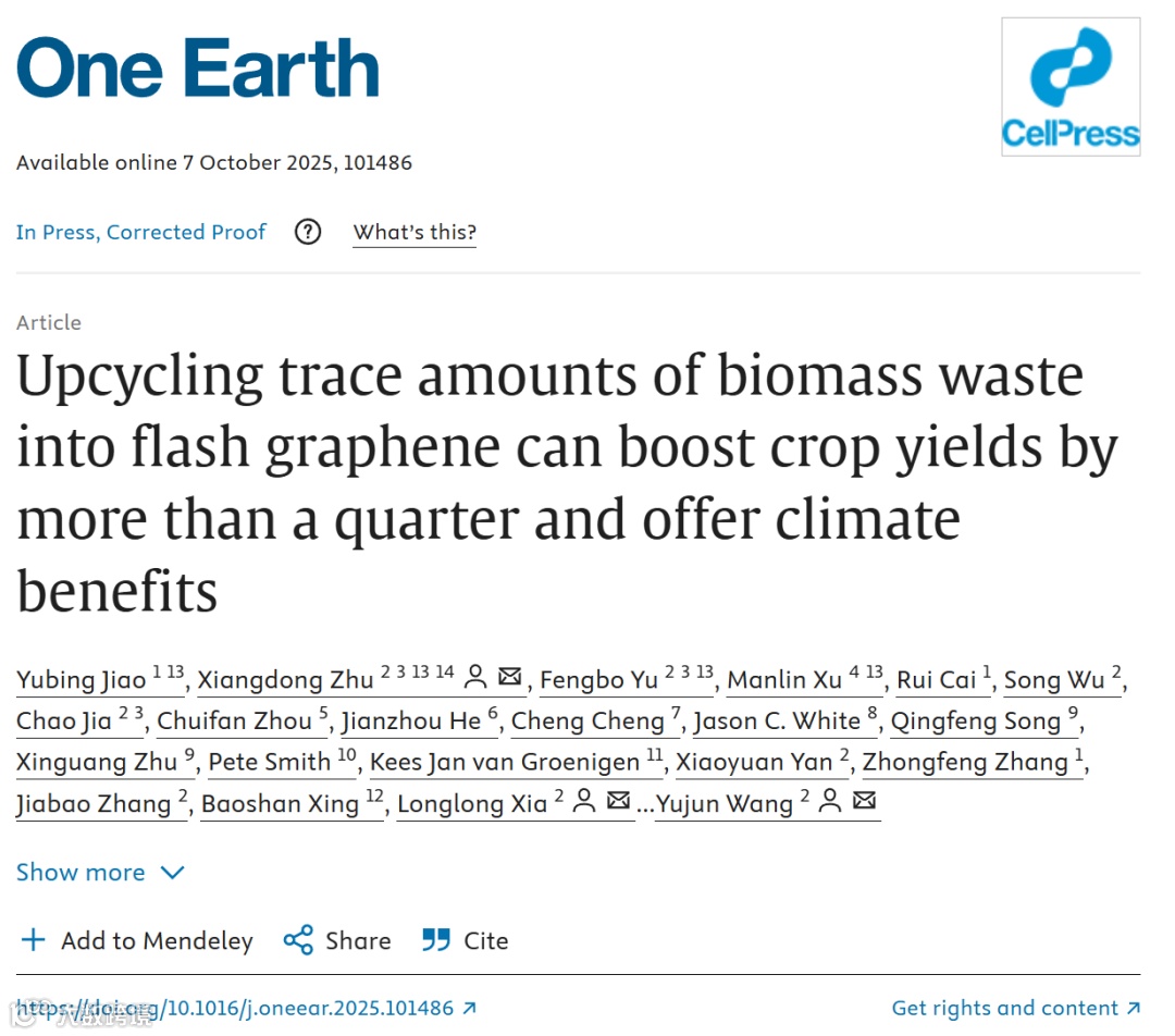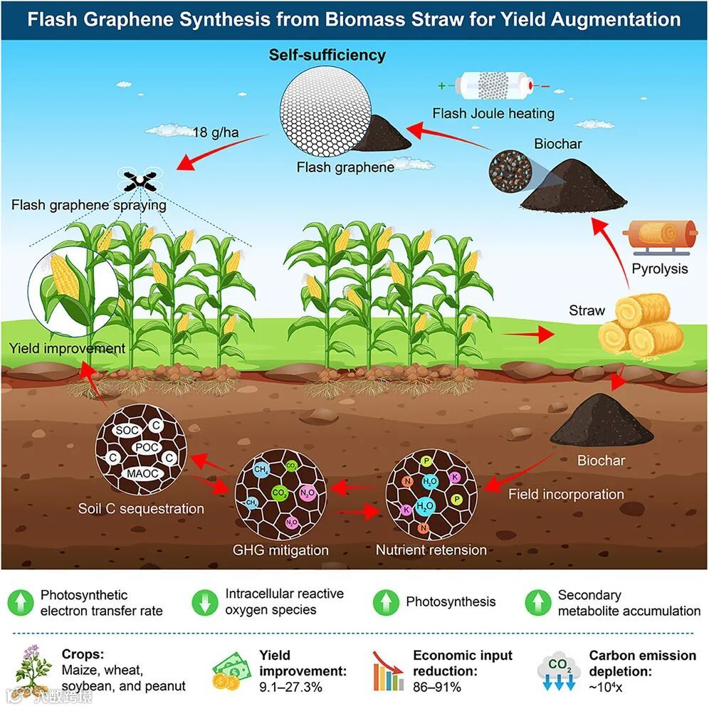 面对农业绿色转型中资源与成本的双重瓶颈,如何实现“微耗材、高效益”的农业生产模式成为关键挑战。近日,复旦大学朱向东研究员与中国科学院南京土壤研究所王玉军研究员、夏龙龙研究员等在《One Earth》上发表突破性研究成果。研究团队创新性地利用闪蒸焦耳加热技术将作物秸秆等废弃生物质转化为闪蒸石墨烯,并通过系统的田间试验证实,每公顷仅施用18克的微量石墨烯,即可通过增强光合作用与激活抗氧化代谢使大豆、花生、玉米和小麦等主要作物增产9.1%–27.3%。该技术构建了“地上叶面喷施-地下生物炭还田”的协同增效体系,在提升产量的同时大幅降低碳排放与农资成本,为发展低碳循环农业提供了全新的系统解决方案。