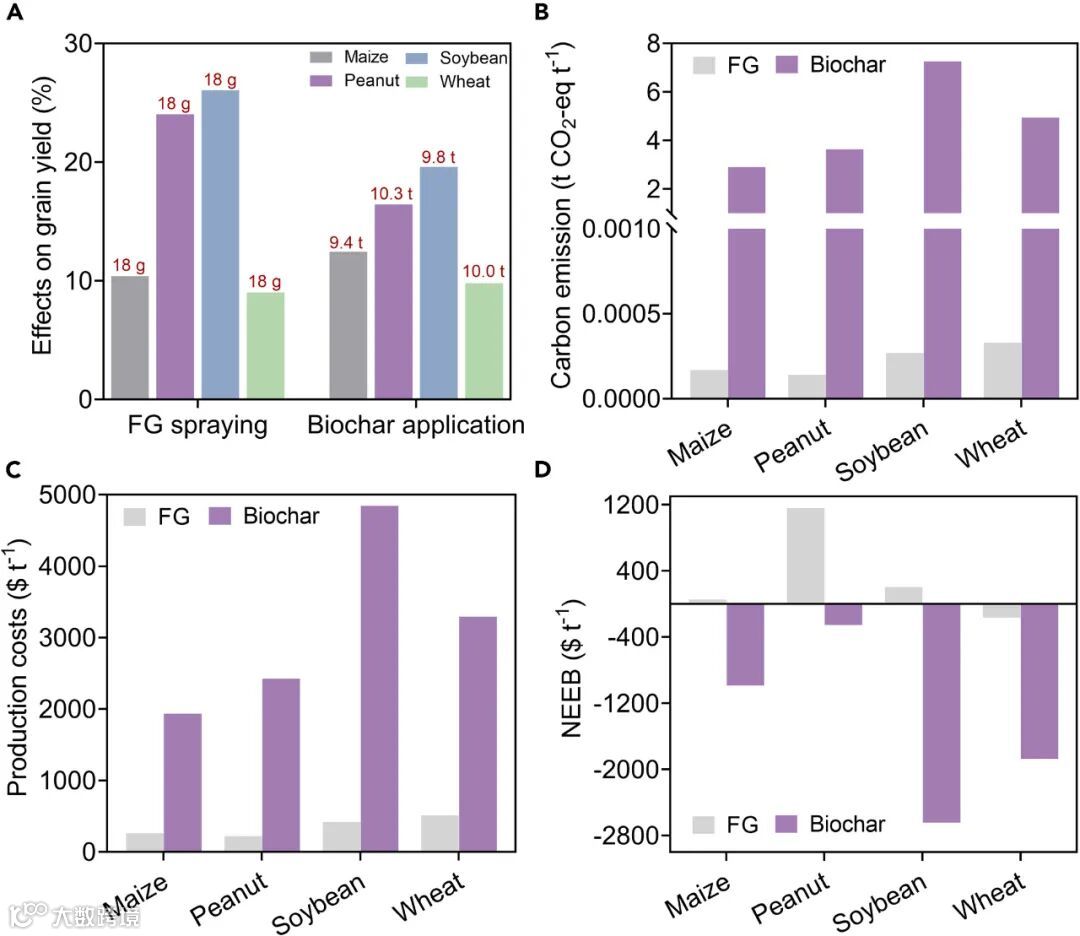 图5 的荟萃分析显示,相较于传统生物炭,FG在相近增产幅度下用量降低四个数量级,碳排放与农资成本显著下降,净生态系统经济效益优异。