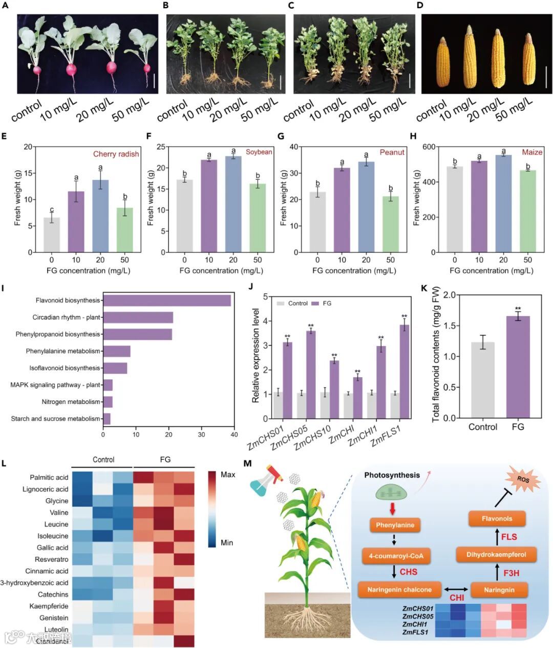 图4 通过多组学分析发现,FG通过调控类黄酮合成等代谢通路激活植物的抗氧化防御系统,从而促进生物量积累。