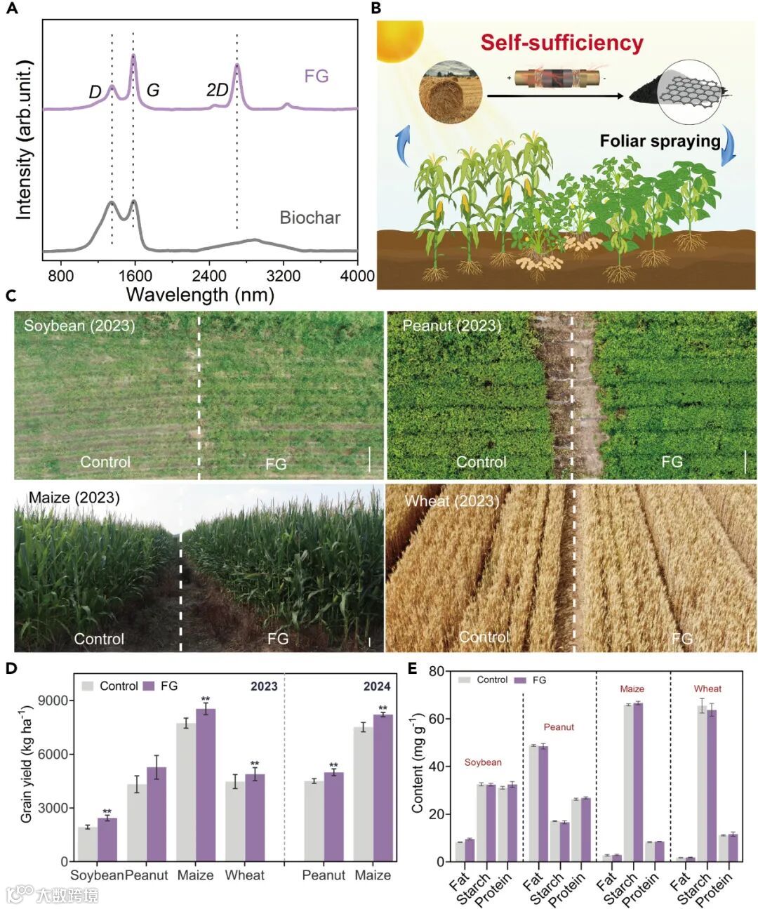 图1 证实了闪蒸焦耳加热法成功制备生物质石墨烯,并通过连续田间试验证明FG处理对大豆、花生、玉米及小麦均有显著增产效果,且不改变籽粒营养成分。