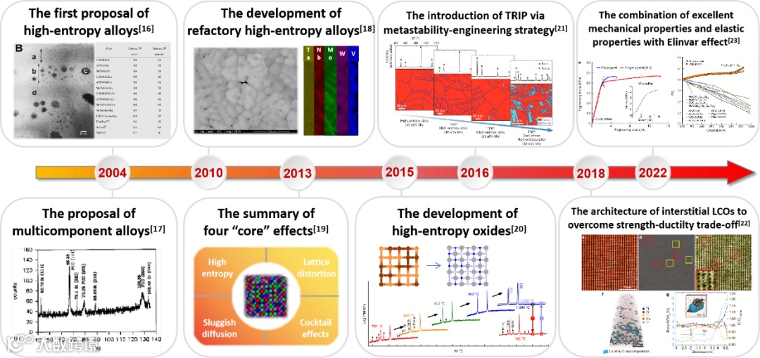 图注: 高熵合金从概念提出到多领域应用的发展历程,展示了这一领域的快速演进和扩大趋势。