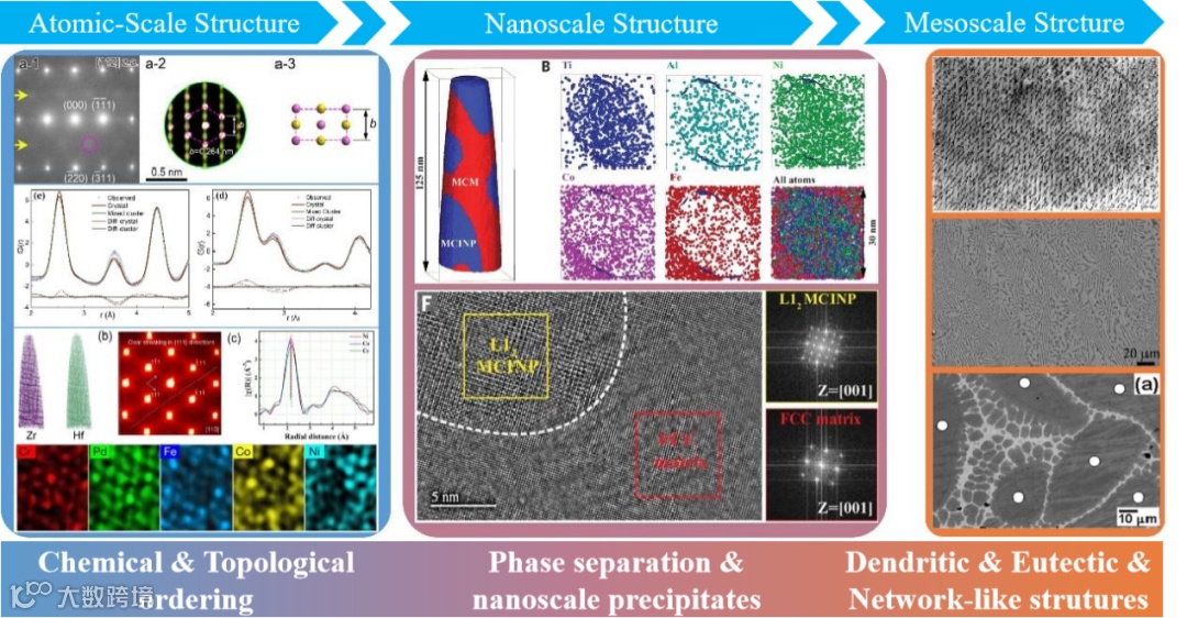 图注: 高熵合金在原子尺度、纳米尺度和介观尺度上表现出的丰富微观结构特征,包括化学有序、相分离和树枝晶等结构。