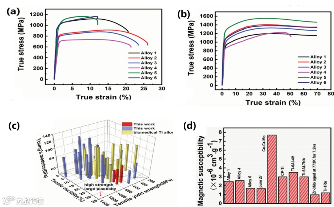 图注: TiZrNbTa等高熵合金展现出优于传统钛合金的力学相容性和生物相容性。