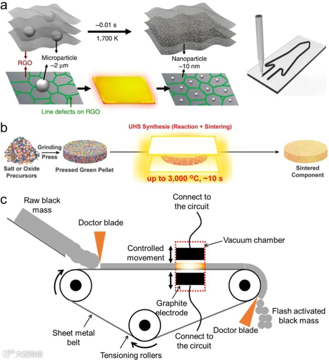 图 1b 陶瓷闪速烧结装置:石墨模具-粉体复合体内脉冲电流焦耳热可在数秒内完成致密化,抑制晶粒长大。
