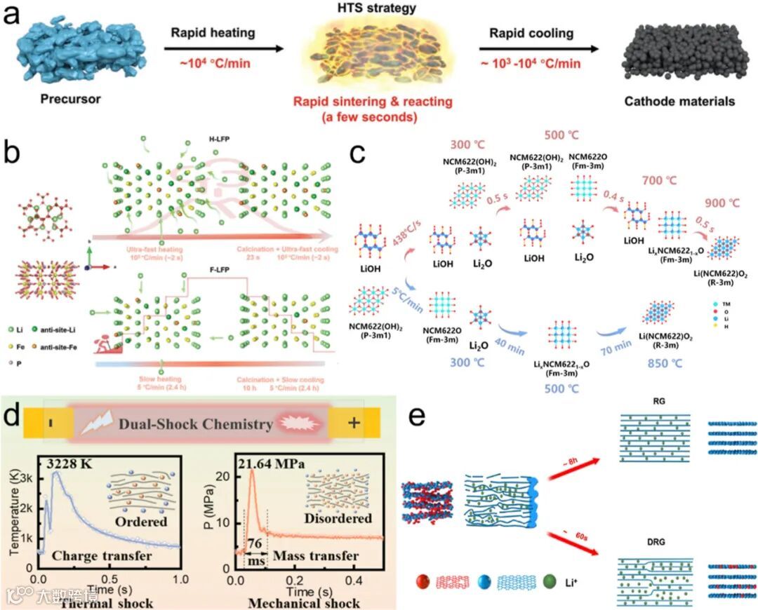 图 2 (a) HTS 合成正极材料示意图;(b) 非平衡(H-LFP)与平衡(F-LFP)焙烧中 Li⁺扩散示意图;(c) HTS-NCM 化学与结构演变;(d) 热冲击与双冲击策略对比示意图;(e) 再生石墨(RG)与富含缺陷再生石墨(DRG)形成示意图。