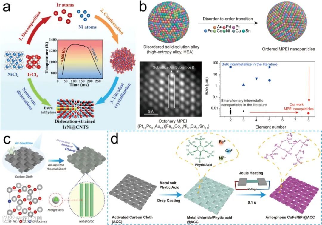 图 4 (a) 位错生成示意图;(b) MPEI 纳米颗粒合成及对比;(c) NiO@C/CC 合成路线;(d) CoFeNiPi@ACC 焦耳热处理示意图。