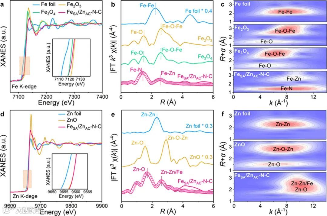 图2通过X射线吸收谱分析了材料的局部配位结构。Fe K边XANES表明Fe价态介于+2与+3之间,FT-EXAFS证实了Fe-N₄位点的形成及其与Zn团簇的近距离相互作用。Zn K边分析确认了超小Zn团簇的形成,为协同催化提供了结构基础。