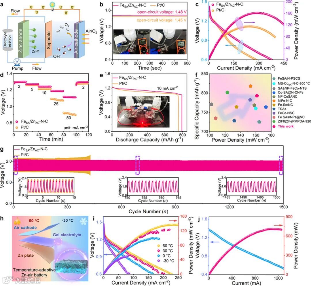 图5展示了锌空气电池的实际性能。基于该催化剂的电池峰值功率密度达161.5 mW·cm⁻²,比放电容量高达792.7 mAh·g⁻¹,组装的准固态电池在宽温域(-30~60°C)和大尺寸条件下均保持稳定输出。