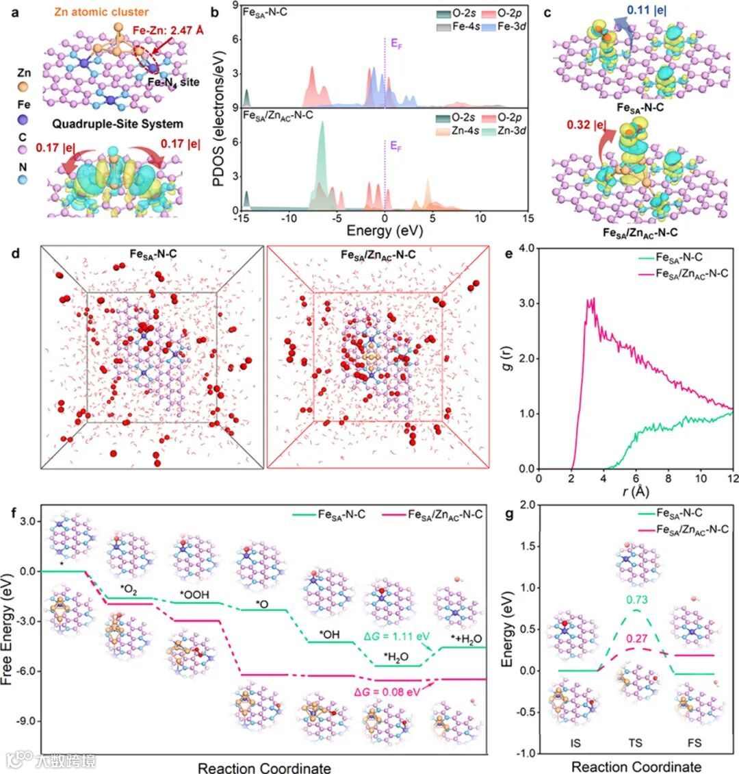 图4通过理论计算揭示了催化机制。DFT与MD模拟表明,Zn团簇负责O₂的吸附活化,远端Fe-N₄位点促进H₂O的形成脱附,形成双活性中心接力机制,显著降低了反应能垒。
