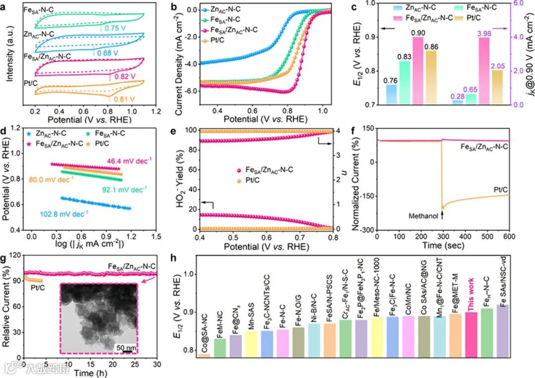 图3展示了催化剂的电化学性能。FeSA/ZnAC-N-C表现出优异的ORR活性,半波电位达0.90 V,Tafel斜率低至46.4 mV·dec⁻¹,且具有优异的稳定性和甲醇耐受性,显著优于Pt/C催化剂。