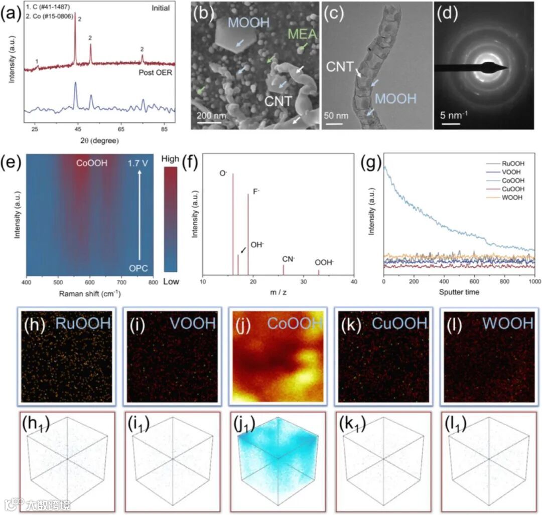 OER 后表面生成 CoOOH 活性层,Ru/W 仍金属态,无溶出;TOF-SIMS 三维元素图证实结构稳定。