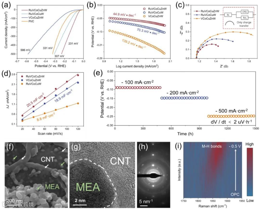 231 mV@500 mA cm⁻²;Tafel 44.9 mV dec⁻¹;Cdl 20.5 mF cm⁻²;原位拉曼 1870 cm⁻¹ 证实 M–H。