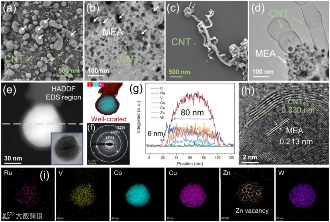 CNT 上 ZIF 前驱体 → 1600 ℃ 闪热 → Zn 秒蒸 → 80 nm MEA 颗粒锚定,孔洞遍布。