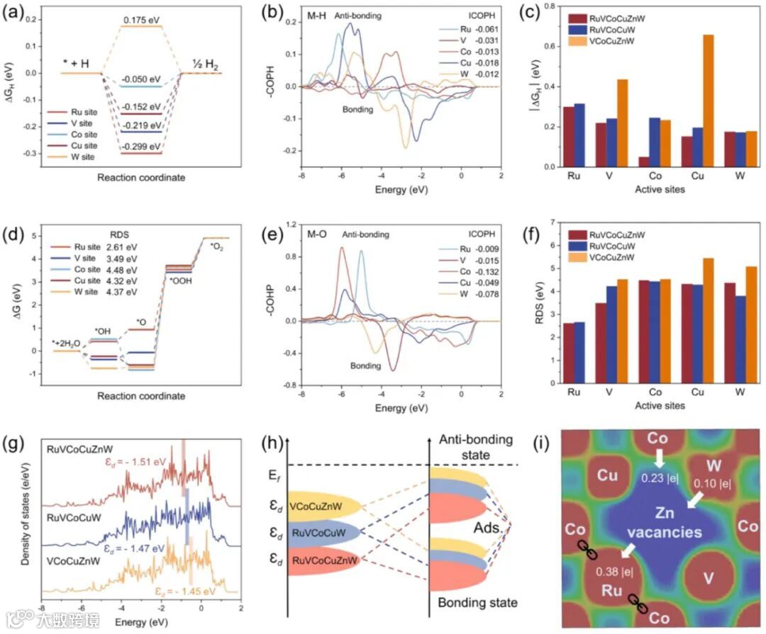 理论实锤:Ruδ⁻-Zn□ 协同,ΔGH* 仅 -0.05 eV,*OOH RDS 降至 2.61 eV。