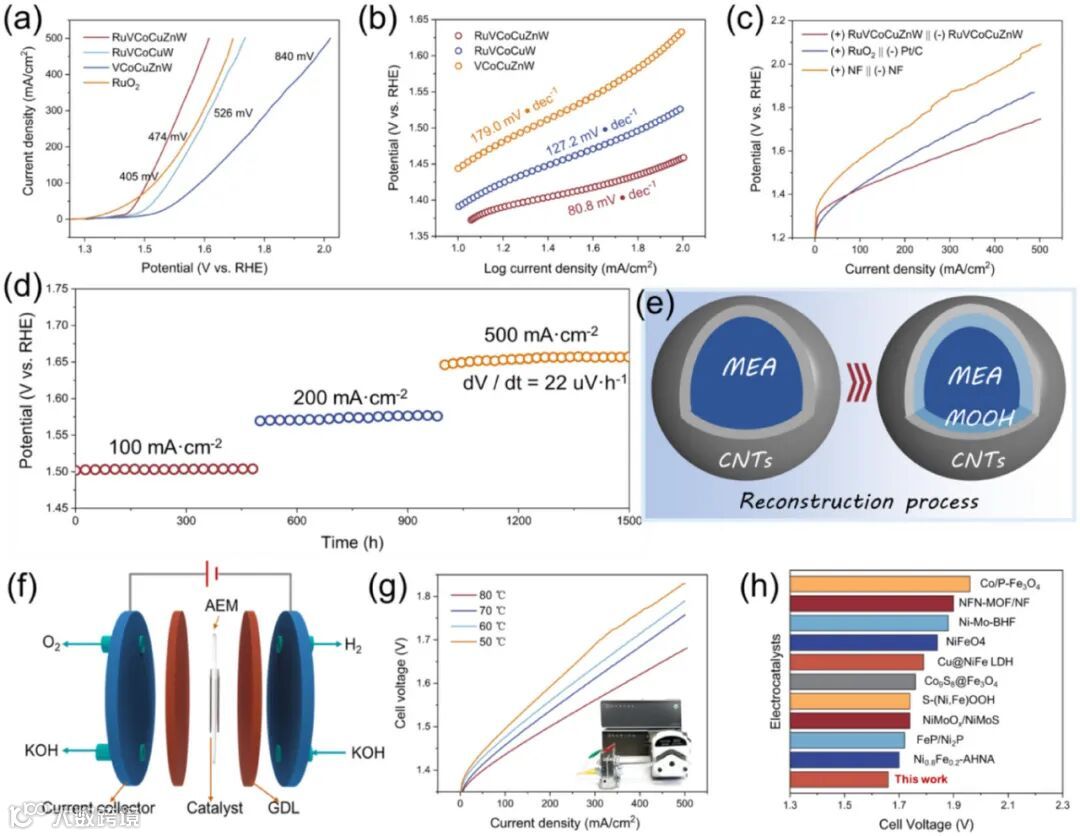 435 mV@500 mA cm⁻²;全解水 1.66 V@500 mA cm⁻²;80 ℃ AEM 电解槽 1500 h 稳态运行。
