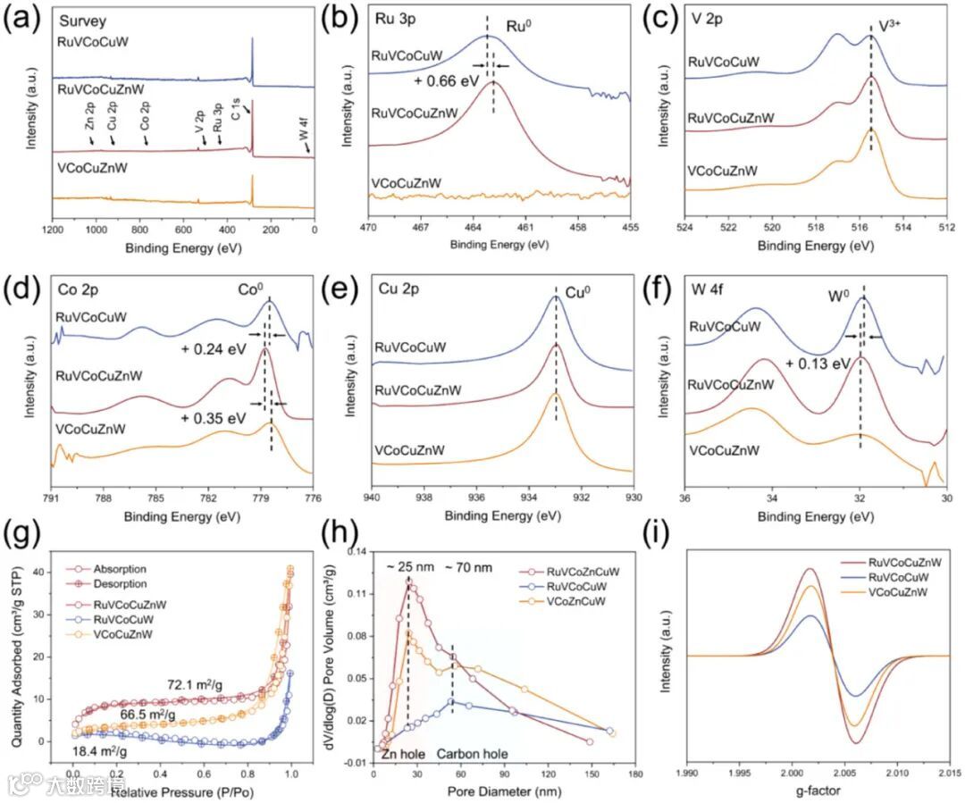 HAADF-STEM:元素均匀,无分相;EPR g=2.004 信号确认空位;XPS Ru 3p 负移 0.66 eV。