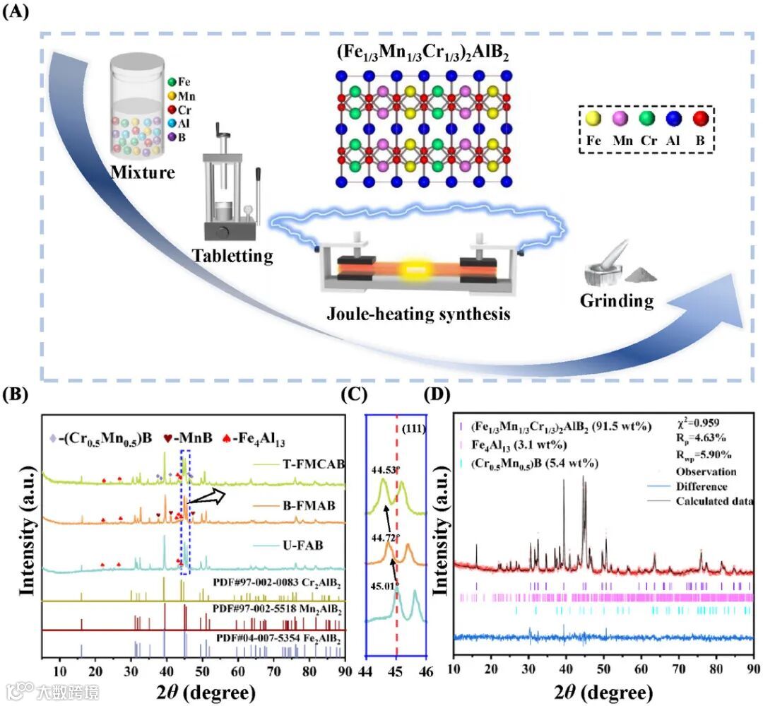 图1A展示了焦耳加热合成流程示意图,图1B的XRD图谱证实成功制备出单一相T-FMCAB材料。图1C显示(111)衍射峰明显宽化,表明晶格畸变与缺陷形成。图1D的Rietveld精修结果验证材料结构完整性。